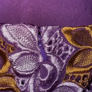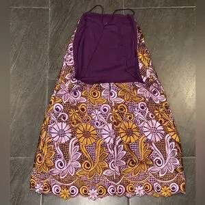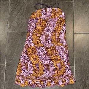 Eye-catching purple and mustard gold floral lace dress with a halter neckline.