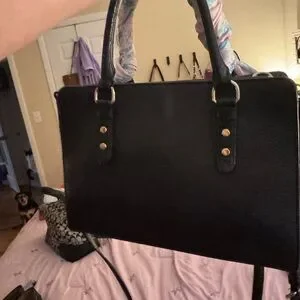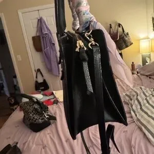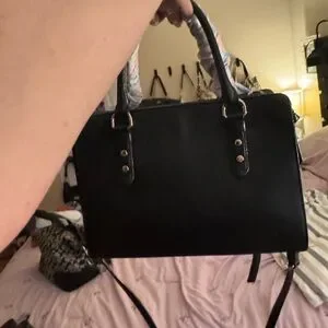Structured black satchel from kate spade. Top handles wrapped in a soft pink scarf. Gold logo hardware on the front. Removable shoulder strap for versatility. Elegant and feminine styling.
