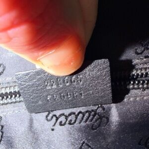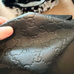 Classic Gucci messenger with embossed GG pattern. Smooth black leather exterior and flap closure. Adjustable shoulder strap for easy carry. Subtle logo plaque on front.