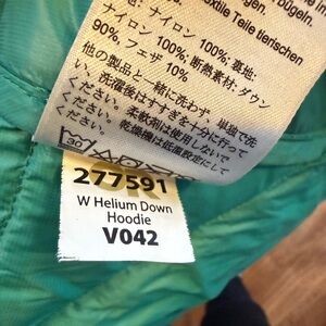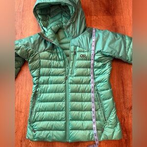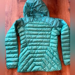 Lightweight insulated down jacket with attached hood. Zip-front closure and zippered hand pockets. Quilted design for warmth and packability. Subtle logo on chest. Great for skiing and cold-weather layering.