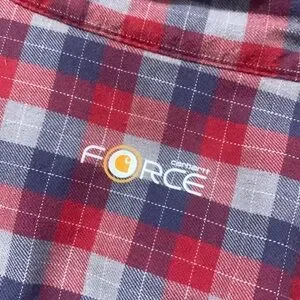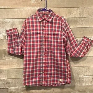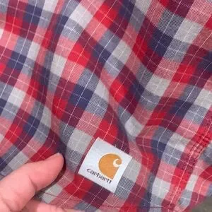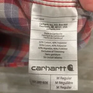 Carhartt force button down shoe size medium … red/blue/ grey… 3 functional pockets… one of them being a hidden zipper pocket.. great condition..