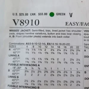 NOS Vogue jacket pattern V8910. Original folds. See photos for pattern details.