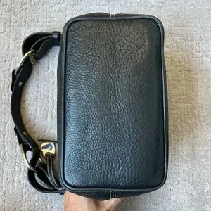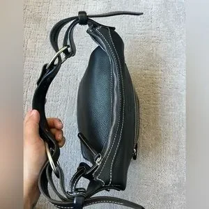 Great condition. Dooney & Bourke shoulder bag in black pebbled leather. Silver tone hardware and buckle details. Adjustable shoulder strap. Blue duck hang tag. Front zipper pocket. Minor corner wear, pictured. Zipper top closure. Cream lining, some minor staining and wear from use (have not tried to clean, please see photos). Interior key fob strap, zipper pocket, and slip pocket.