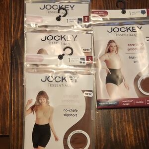 Jockey Essentials shaping panties in brown and nude. Includes high-waist briefs and no-chafe slipshorts. Smooth, tummy-smoothing design with no-roll waistband. Breathable, seamless construction for everyday comfort. All 5 for 13 dollars.