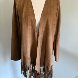 Suede-look open-front jacket with fringe hem. Soft drape and relaxed fit. Versatile layer for casual outfits. Clean lines and subtle paneling.