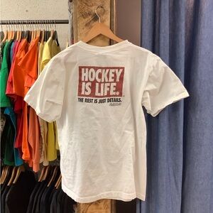 White short-sleeve graphic t-shirt with bold text reading "Be Kind To Animals Kiss A Hockey Player". Features red and black lettering and a printed hockey goalie mask graphic. Casual, playful design. Great for hockey fans.