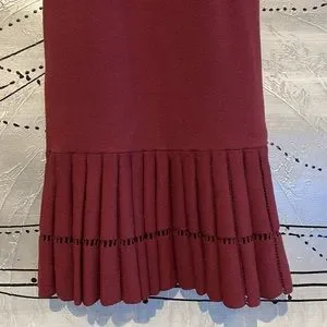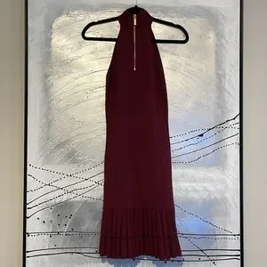 Style Tags: Fit and flare. Halter-neck. Mock neck. Sleeveless. Ruffles. Pleating. Pleated. Cutouts. Exposed zipper. Formal wear. Evening wear. Sophisticated. Classic. Elegant. Fancy. Glamour. Glamorous. Trendy. Timeless. Wardrobe staple. Feminine. Sexy. Party. Occasion. Event. Wedding. Cocktail dress. Christmas party. Festive. New Year’s Eve. Prom. Bold. Burgundy. Red-purple. Maroon. Merlot. Berry. Wine. Mulberry. Plum. Cranberry. Sangria. Dark red. Spring. Summer. Fall. Autumn. Winter. All season. Luxury. MK. Preowned. Used.