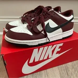Like new!! Box included. Nike Low Dunks in maroon and white with black swoosh. Minimal signs of wear, they are in PERFECT condition!