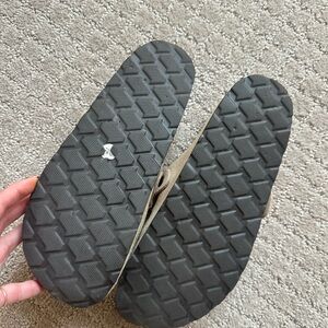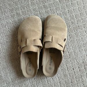 Comfortable beige suede slip-on clogs. Soft suede upper and cushioned footbed provide all-day comfort. Easy on/off design with adjustable buckle for a secure fit. Versatile beige color pairs with everyday outfits.