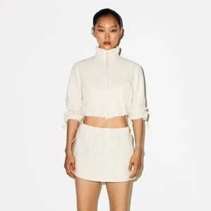 Matching two-piece set. Cropped zip-up jacket with high collar. Coordinating mini skirt with clean lines. Soft cream color perfect for layering.