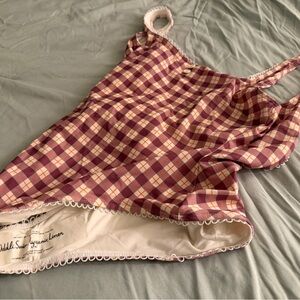 Classic plaid one-piece swimsuit from Oddli, size large. Scoop neckline with button detail. Cream base with mauve, plum, and rust-orange accents. Feminine lace trim along edges. Simple, stylish beachwear. NWOT / new without tags, never worn (sanitary linen and original packaging included).