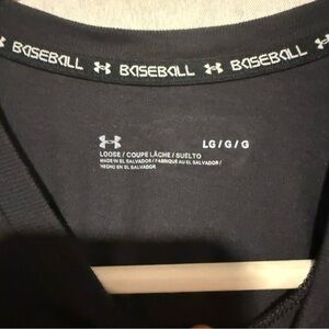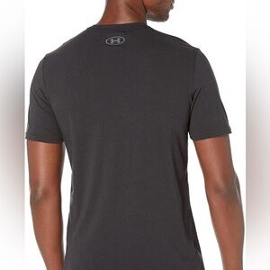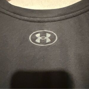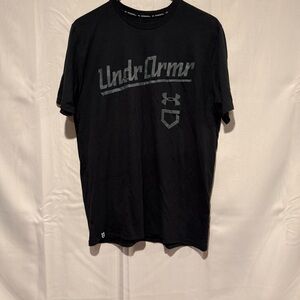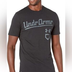 NWOT Under Armour short sleeve tee with bold chest script and logo. Soft, lightweight fabric for daily wear. Sleek black base with contrasting gray graphic. Casual athletic style for workouts or downtime.