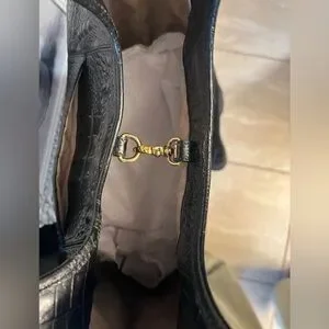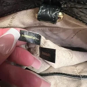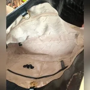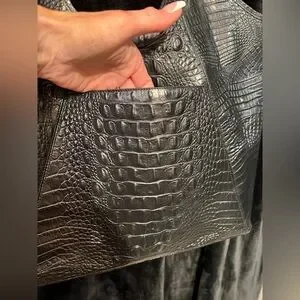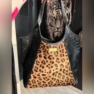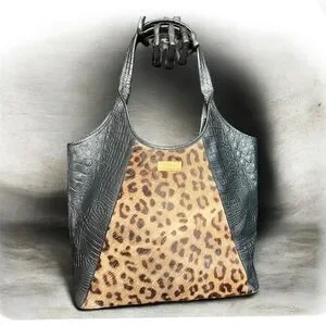 This Vintage Brahmin is made of Genuine black croc-embossed leather and leopard print calf hair with embossed fabric interior lining. It features a LARGE SPACIOUS interior with 1 interior zip pocket, 2 slip pockets, 2 pen holders, and a key clip. Lobster claw clasp closure.