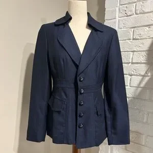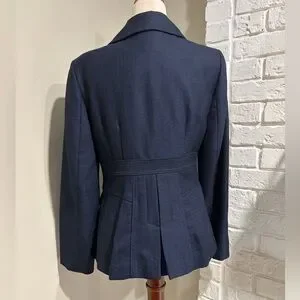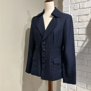 Women’s Structured navy blazer featuring a smooth burgundy satin lining. Classic notched lapel and tailored silhouette. Polished choice for office or events. Excellent Condition and Closet kept in a smoke free home.