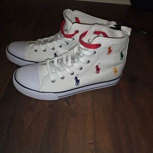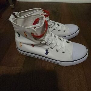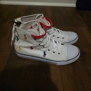 Stylish high-top sneakers. White canvas with multicolor Polo logo embroidery. Comfortable and trendy design.