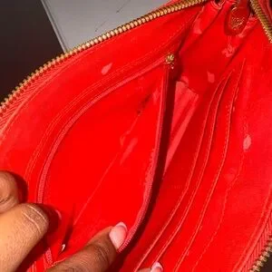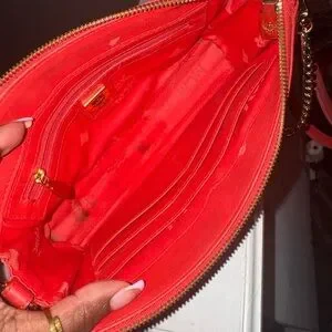 GUC. Comes with original crossbody strap and added shoulder length chain. Credit card slips on the inside. Stains on the inside. Light stickiness on the outside.