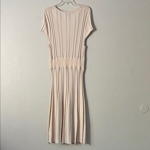 Elegant cream ribbed knit midi dress with a flattering scoop neckline. Soft stretch fabric sculpts the waist for a polished silhouette. Short sleeves and pleated skirt create easy, feminine movement. Perfect for day-to-night styling in neutral cream.