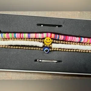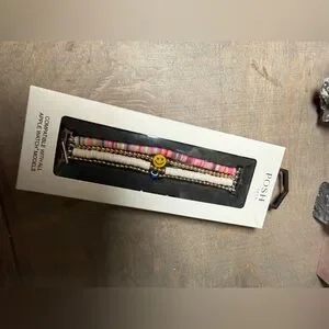 POSH stacked bracelet set with bright pink and white beads. Gold-tone spacer beads and charm accents add shine. Fun multicolor heishi bead strand adds a playful touch. Stretch design for easy wear.