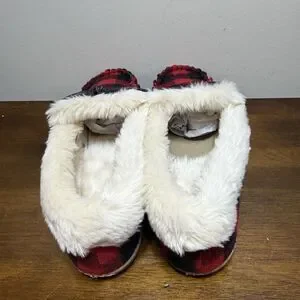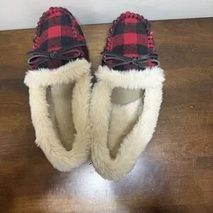 J Crew NWOT Red & Black Buffalo Plaid Faux-Shearling Moccasin Slippers Size 9
