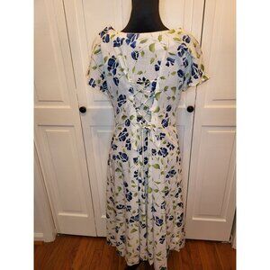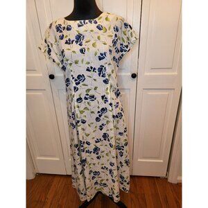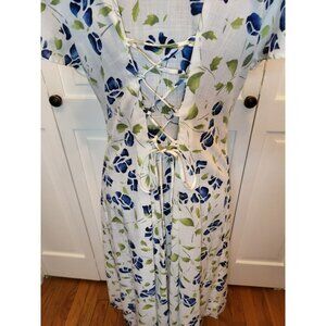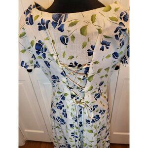 Vintage 90s homemade custom white and blue watercolor print dress is a step back in time. Dress features a lace up corset in back, cap sleeves, inverted pleats in front, and midi length. Dress, of course, has no tag but is shown unpinned on size small. Fabric appears to be a cotton and linen blend.