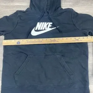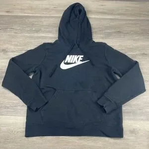 This is a Nike Sportswear Club Fleece Women's Hoodie in a size medium. The hoodie is in solid black color with a pullover style and long sleeves, making it suitable for activewear. The fabric is fleece, providing warmth and comfort. This Nike hoodie is part of the Sportswear line and features the Nike logo. It is a stylish and versatile piece for women's wardrobe.