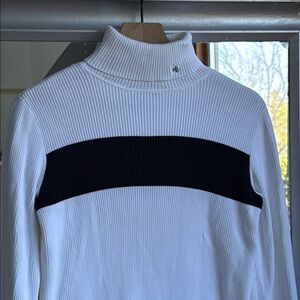 Stay stylish and warm with this elegant white and black turtleneck sweater. Perfect for any occasion.