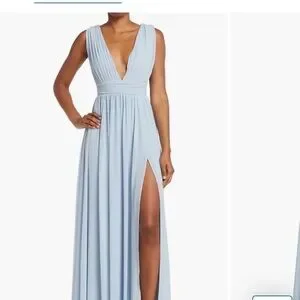 A flowing light blue maxi dress with a flattering plunging V-neck and pleated bodice. The dress features a ruched waistband and soft, draping skirt for a graceful silhouette. Perfect for weddings guest, bridesmaid dress, formal events, or special occasions. Only worn once, Size Medium