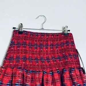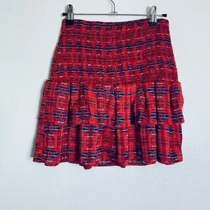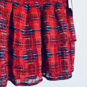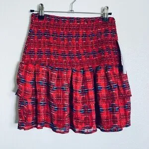 Smocked waistband for stretch and comfort. A-line mini with a soft ruffled hem. Red base with blue and black patterned accents. Versatile styling for daytime or evening looks.