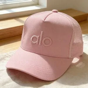 This soft bubblegum pink Alo trucker cap features a premium twill cotton front panel with a structured crown, paired with ultra-breathable white mesh side and back panels for optimal airflow. The brand’s iconic "alo" logo is expertly embroidered in raised white thread on the front, creating a striking contrast against the pink base. It has a curved, stitched brim for durable sun protection and an adjustable plastic snapback closure at the rear, ensuring a customizable fit for head circumferences from 56cm to 60cm. Lightweight and flexible, this cap is ideal for gym workouts, outdoor runs, casual errands, or beach days, seamlessly blending sporty functionality with a playful pop of color.