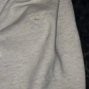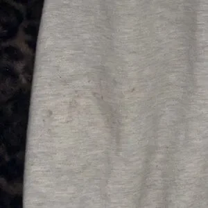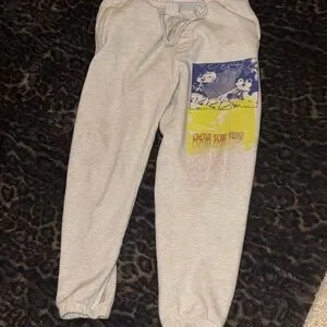 Soft gray jogger sweatpants with a bright yellow and blue graphic. Comfortable elastic waist and cuffs for everyday. Stylish printed detail adds personality to any outfit. slight discoloration pictured from laundry color stain