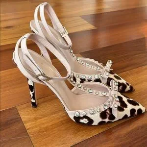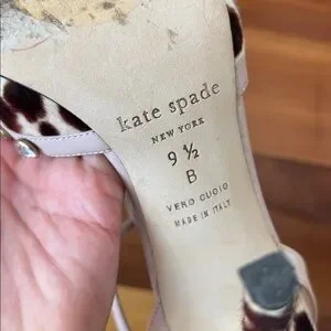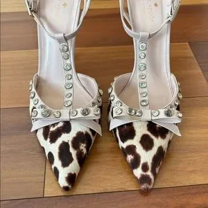 Gorgeous nude/pale blush pink leather t-strap Kate Spade Lydia pony hair heels with rhinestone embellishment and bow. Good used condition. Made in Italy.