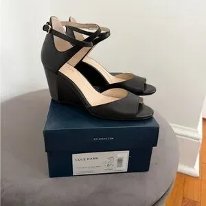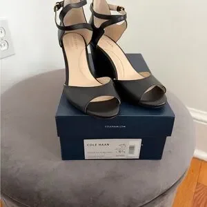 Elegant Cole Haan black leather heels with open toe. Ankle strap with buckle for secure fit. Cushioned insole for added comfort. Sleek silhouette for dressy occasions. These have only been worn in the house.