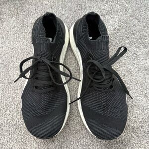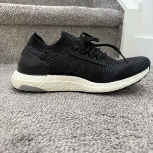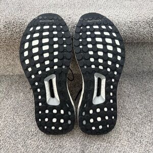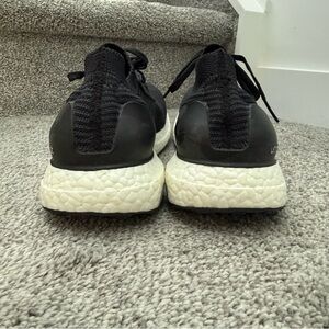 Breathable knit upper with secure lace closure. Cushioned white boost midsole for energy return. Low-profile design for everyday wear. Size 9 US. Part of the ultraboost line. Excellent condition, light dirt on sole.