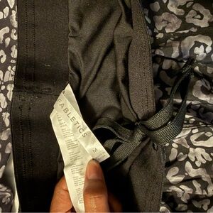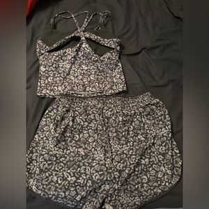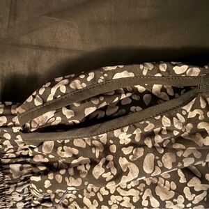 Fabletics matching active set with gray leopard print on black fabric. Elastic waistband with tie for adjustable fit. Smooth performance material for workouts or casual wear.