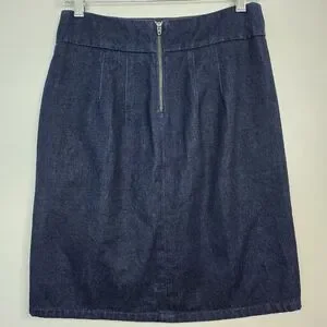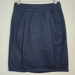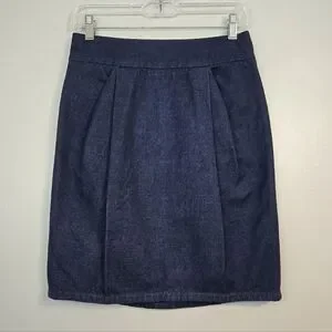 Timeless dark blue denim skirt with a flattering pencil silhouette. Structured lines & subtle pleating create a polished look that's easy to pair with tees, blouses, or blazers for versatile styling.