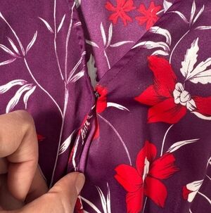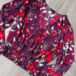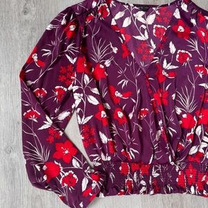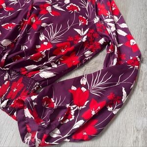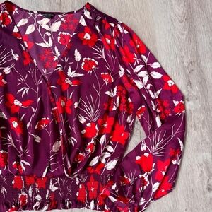 Guess Vibrant Satin Purple Red White Floral Smocked Waist Blouse Size XL