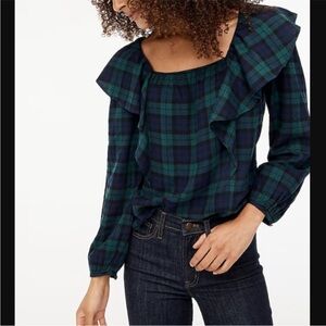 J.Crew Factory Women's Black Watch Tartan Flannel Squareneck Ruffle top NWT
