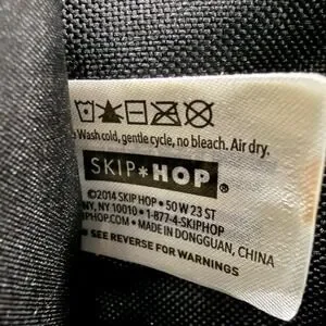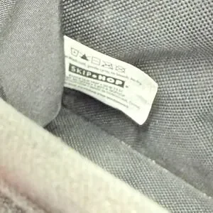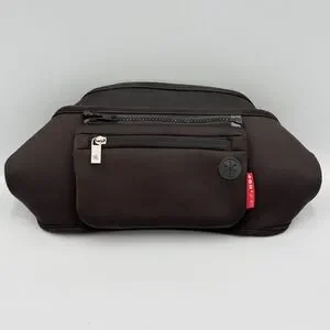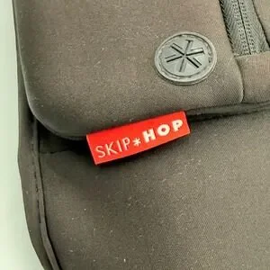 Skip Hop Grab & Go stroller organizer in black neoprene. This universal stroller caddy features adjustable velcro straps to fit most stroller bars and handles. Designed with two insulated drink holders and a large center compartment for easy access to essentials. Includes a detachable wristlet with a headphone port for hands-free use. The stretchy neoprene fabric is durable and machine washable.