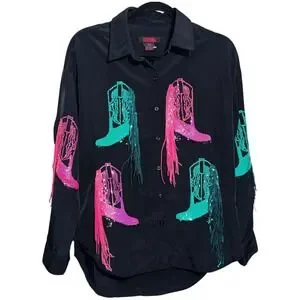 Eye-catching statement piece with teal and pink boot designs, combining western style with a fun, glam twist. Lightweight fabric with a relaxed fit, perfect for layering or wearing on its own.