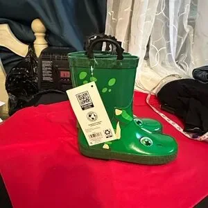 Fun green frog-themed rain boots for kids. Bright green color with playful frog face and accents. Waterproof design keeps feet dry during wet weather. Easy pull handles for quick on and off. Comfortable and kid-friendly construction for active play.