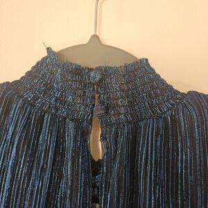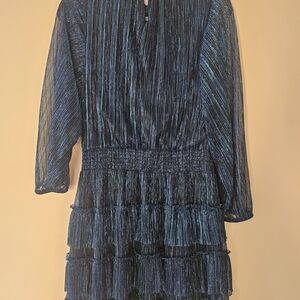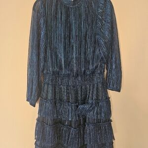 Chic blue textured tiered mini dress with long sleeves. Smocked waist provides a flattering fit. Lightweight fabric with subtle vertical texture creates movement and shine. Versatile style perfect for events and evenings.