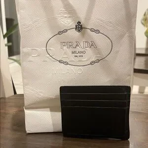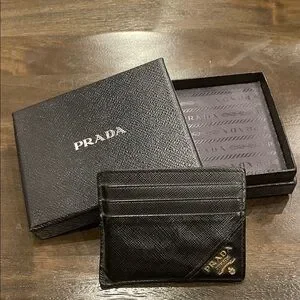 Prada Black Saffiano Leather Card Holder with Gold Logo Accent