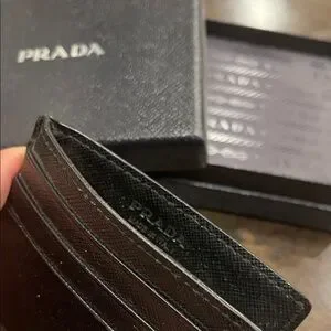 Compact Prada card holder in textured Saffiano leather. Four exterior card slots and a slim central pocket. Polished gold Prada logo detail at corner. Sleek, minimal design for everyday use.