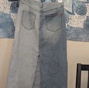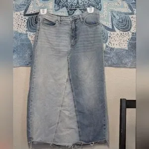 Two-Tone Light Denim Maxi Skirt 14 Slit Raw Hem Boho Indie Sleaze Pockets