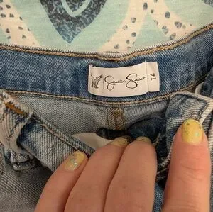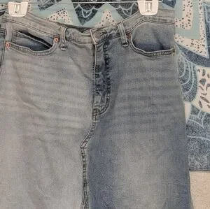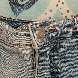 Light wash denim midi skirt with a center front panel detail. Two-tone faded blue denim. Raw hem finish. Classic five-pocket styling.
