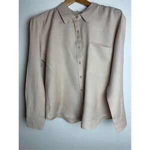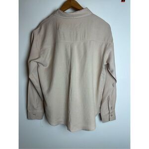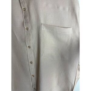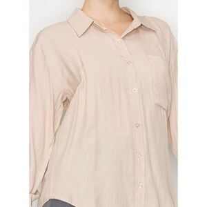 A basic linen shirt top features collar, button down, chest pocket, long cuffed sleeves, waist length, and a curved hem.