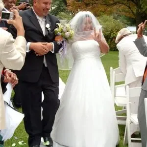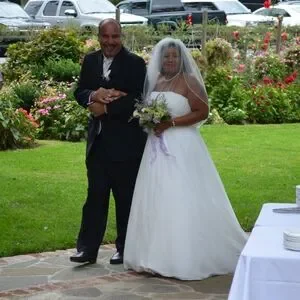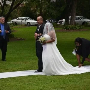 Elegant strapless wedding dress. White fabric with soft gathers and a beaded waist detail. Includes sheer veil overlay. Classic and timeless silhouette.