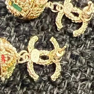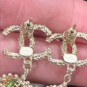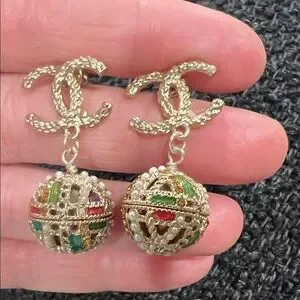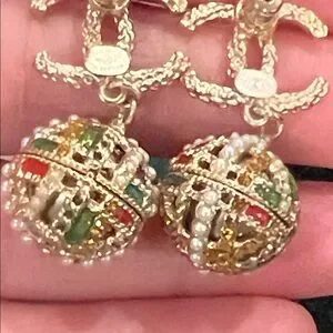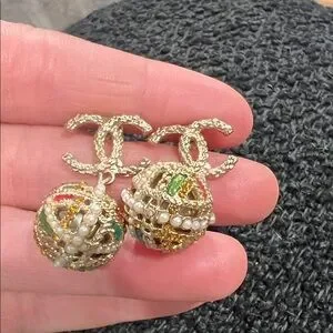 Gold-tone Chanel drop earrings featuring interlocking CC tops. Filigree globe pendants with green, red and turquoise enamel insets. Tiny pearl beads accent the design. Chic, statement-making pair.