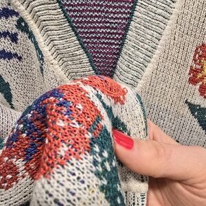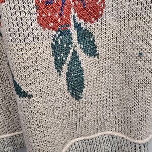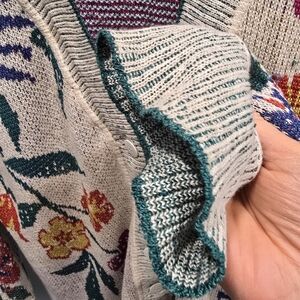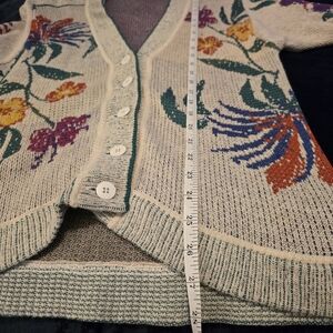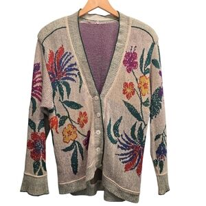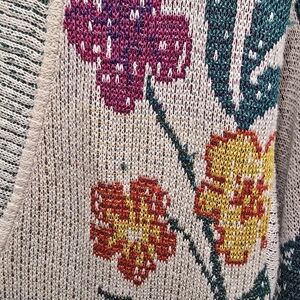 Lightweight beige cardigan with colorful floral embroidery. Open front with long sleeves. Versatile piece to layer over dresses or casual outfits.