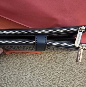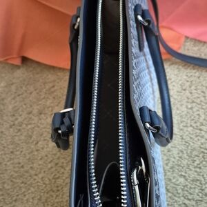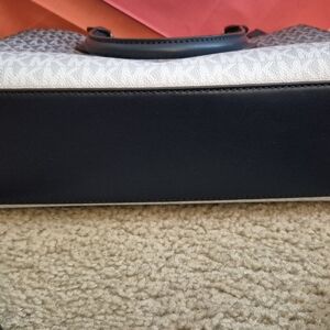 ***SMALL CALL OUT ON WALLET WHERE YOU PUT YOUR LICENSE*** SMALL PULL IN THE PLASTIC. Michael Kors tote with iconic MK monogram. Includes coordinating wristlet for added convenience. Leather trim and top handles. Silver-tone MK charm and zipper hardware. Sleek, versatile design for daily use.